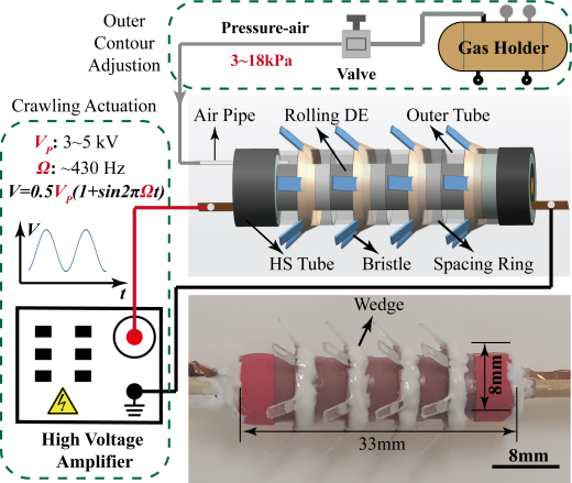近日,中国科学院深圳先进技术研究院微创中心高兴副研究员团队与运城学院杜阳阳博士在亚厘米级管道/腔道机器人取得重要进展。团队基于介电弹性体(DEA)开发的电活性球囊外廓仅8mm,结合鞭毛驱动原理创新设计了一款可自适应管道内径变化的变直径纯软体胶囊机器人。初代样机验证了其整体柔...