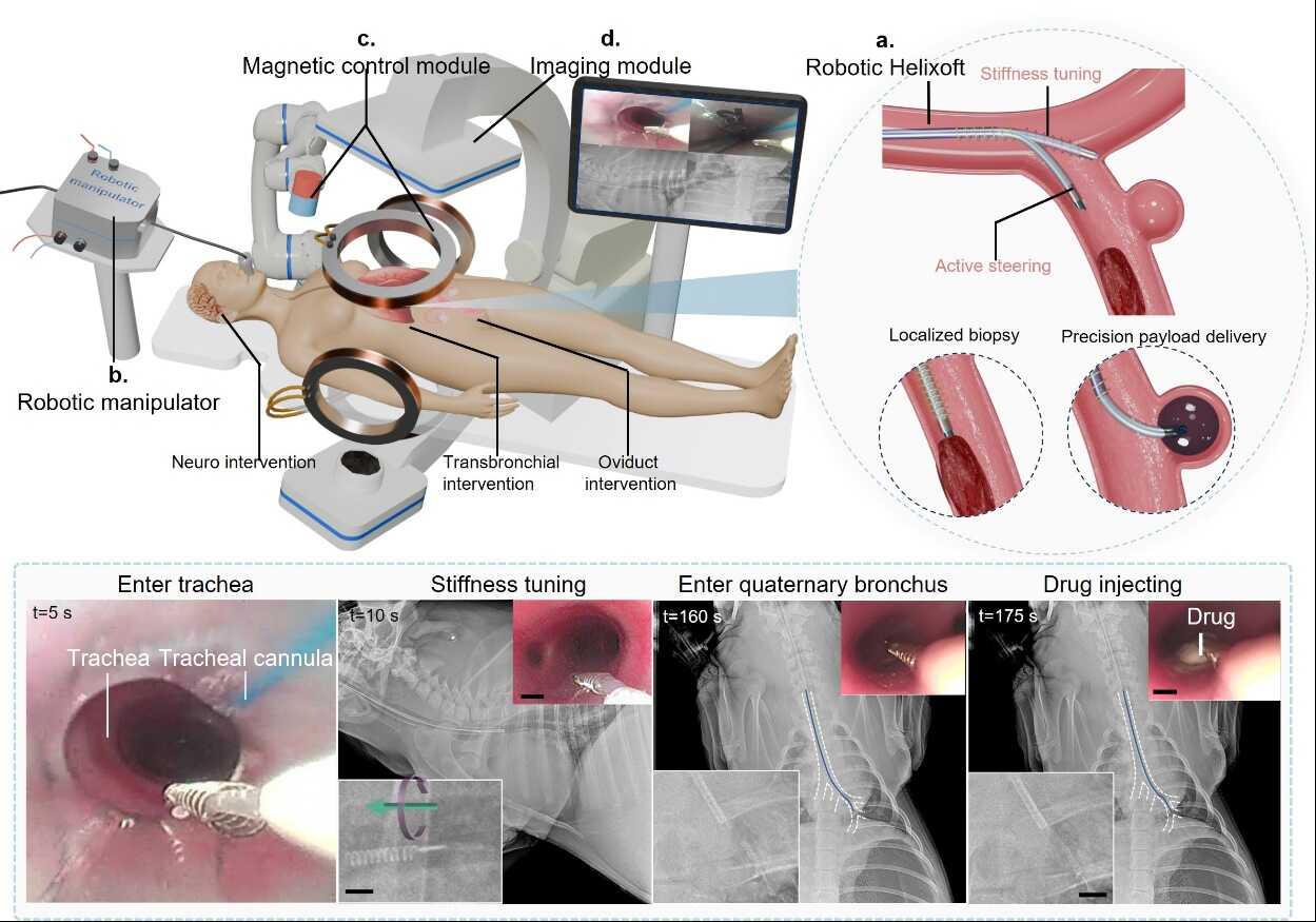 中国科学院深圳先进技术研究院生物医学与健康工程研究所徐海峰研究员团队在磁控微米机器人导管领域取得重要进展。研究团队研发出一种基于磁性螺旋形机器人的微机器人系统(Helixoft),该系统可无缝集成至商用微导管中,首次在微米尺度实现了远程且无损的磁控可编程刚度调节,并兼具主动...