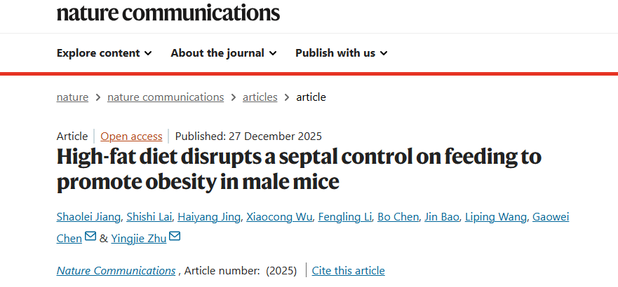 Nature Communications丨发现高脂饮食导致外侧隔核功能失调进而加剧肥胖的新机制