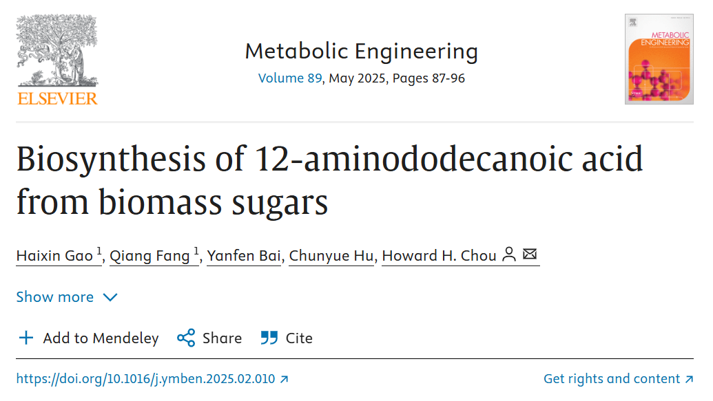 近日,由中国科学院深圳先进技术研究院合成生物学研究所合成生物化学研究中心的Howard H. Chou课题组在Metabolic Engineering期刊上发表了题为“Biosynthesis of 12-aminododecanoic acid from biomass sugars”的重要研究成果。