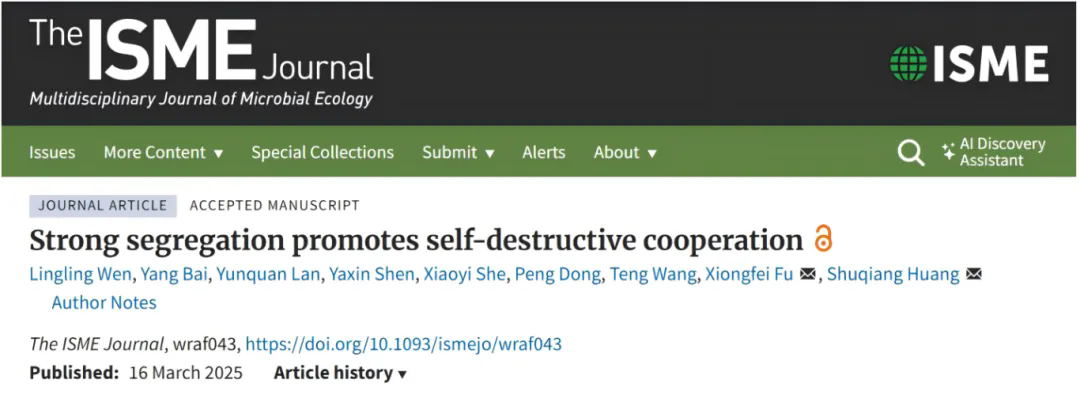 近日,由中国科学院深圳先进技术研究院合成生物学研究所定量合成生物学全国重点实验室/合成生物进化研究中心的黄术强和傅雄飞课题组在国际微生物生态学会期刊The ISME Journal发表了题为"Strong segregation promotes self-destructive cooperation"的研究,通过定量合成生物学方法揭示了微生物如何在压力环境中通过“自我牺牲”行为实现群体生存的新机制。