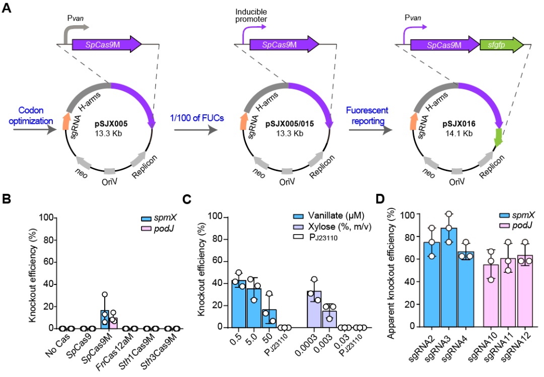 其次,研究团队通过调控SpCas9M的表达水平来提升编辑效率。研究人员测试了两种诱导型启动子,香草酸诱导型启动子(Pvan)和木糖诱导型启动子(Pxyl),检测不同诱导剂浓度下的基因编辑效率。结果发现相对较低的SpCas9M表达水平更有利于新月柄杆菌的基因组编辑,编辑效率最高可达到40%左右。