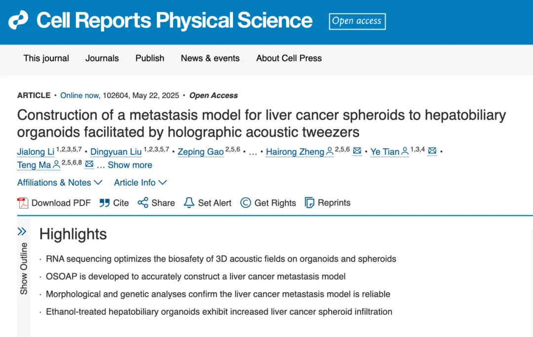 5月22日,中国科学院深圳先进技术研究院科学仪器所(筹)马腾研究员团队和哈尔滨医科大学田野教授团队合作在Cell旗下刊物 Cell Reports Physical Science上发表题为“Construction of a metastasis model for liver cancer spheroids to hepatobiliary organoids facilitated by holographic acoustic tweezers”的研究成果。该工作主要通过全息声镊科学仪器产生的具体生物医学应用,围绕全息声镊和三维细胞培养技术构建了类器官-细胞球在线组装平台,通过该平台构建了一种精准、可靠且具有多功能性的肝癌转移类组装体模型。此外,该研究还通过RNA测序技术评估了不同参数下声压对类器官和细胞球基因层面的影响,进一步的优化了操控参数。