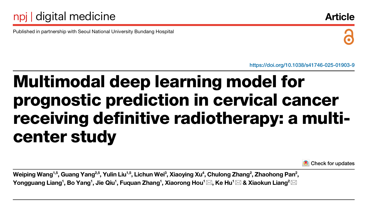 近日,中国科学院深圳先进技术研究院(深圳先进院)医工所梁晓坤副研究员团队,联合了北京协和医院、空军军医大学西京医院、大连医科大学第二附属医院多家顶尖医院,成功开发出一种智能工具——CerviPro多模态放疗预后预测模型。该模型能够精准告诉医生:患者属于高风险群体,需加大治疗力度;还是低风险群体,可考虑简化治疗方案等信息。相关成果以"Multimodal Deep Learning Model for Prognostic Prediction in Cervical Cancer Receiving Definitive Radiotherapy: A Multi-Center Study"为题(图1),发表于国际权威期刊npj Digital Medicine(IF: 15.1)。