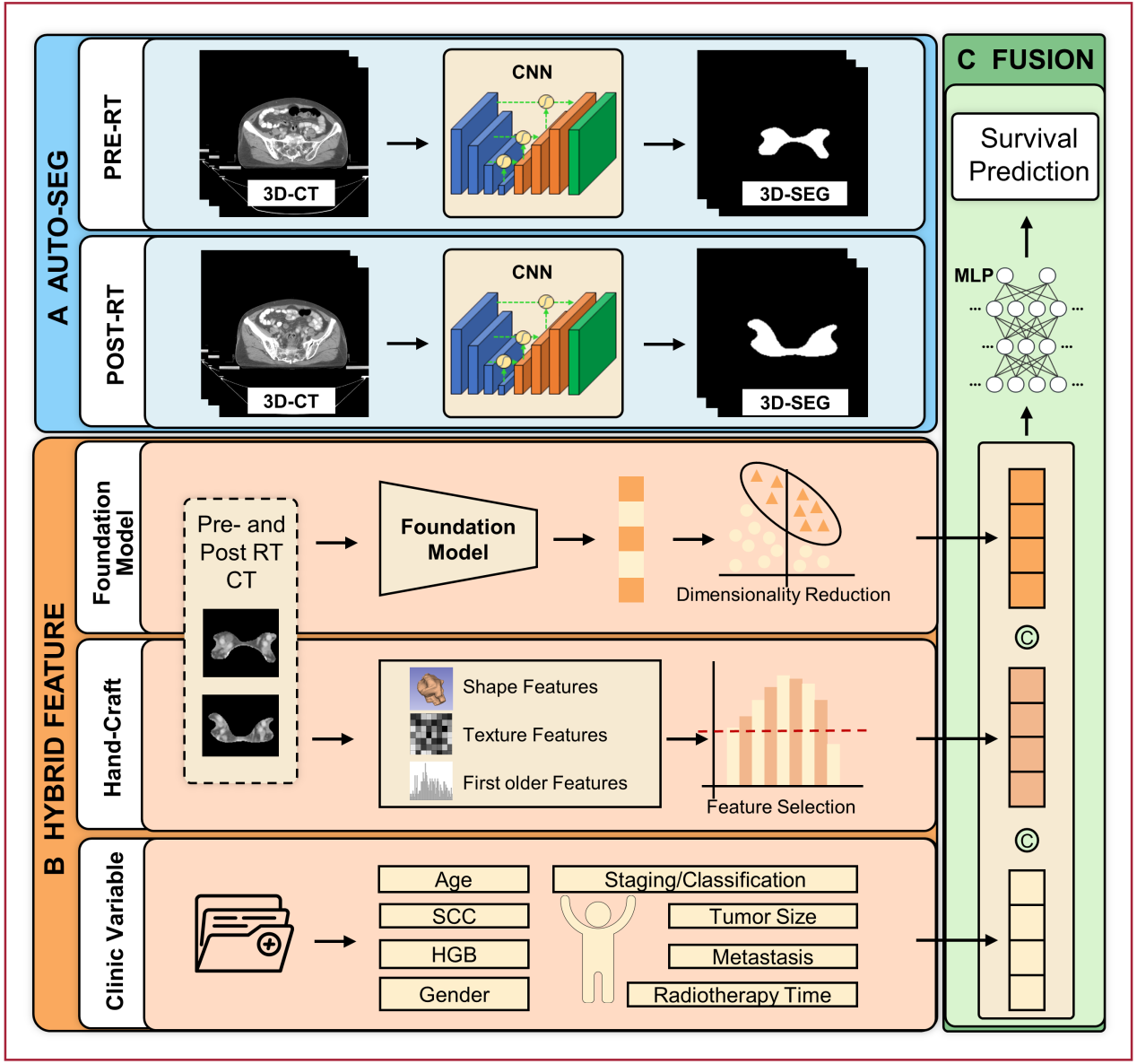 研究团队提出了一种融合放疗前后CT基础模型特征、影像组学特征与临床信息的多模态深度学习预后预测方法(图2)。该方法首先采用基于深度学习的自动分割技术精准提取肿瘤区域,随后利用预训练CT基础模型提取高维深度特征,并通过主成分分析降维和特征筛选技术,实现多源异构数据的智能融合。