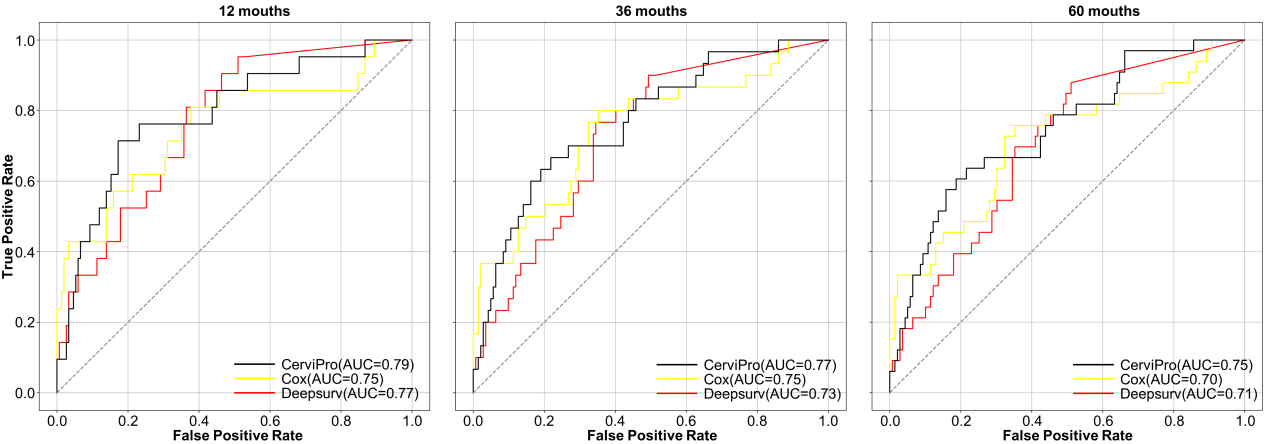 为确保模型的临床实用性,研究团队联合北京协和医院、空军军医大学西京医院、大连医科大学第二附属医院,共同收集了1018例宫颈癌患者的多模临床数据(图3)。通过多中心验证设计,验证了模型不仅在单一医院表现优异,还能适应不同医院的实际临床环境。提出的CerviPro模型的结果表现超越传统Cox模型和DeepSurv模型,体现了整合不同数据源的协同价值,为临床医生精准识别高危患者、制定个体化治疗策略提供了可靠的智能决策工具(图4)。