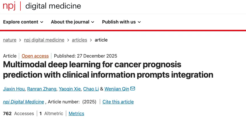 近日,中国科学院深圳先进技术研究院医学成像科学与技术系统全国重点实验室秦文健研究员,提出一种临床信息提示整合的多模态预后预测新框架,通过设计临床文本模板和基础大模型,将结构化临床数据转化为高维语义特征,并通过交叉注意力机制实现病理图像、基因组与临床信息的高效融合,提升癌症生存预测精度。研究成果以"Multimodal deep learning for cancer prognosis prediction with clinical information prompts integration"为题,发表于国际数字医学权威期刊npj Digital Medicine(图1)。