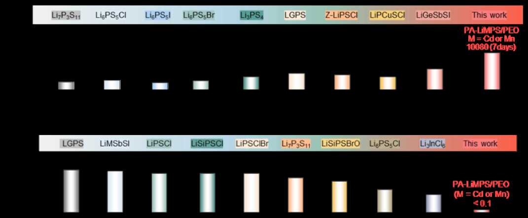 在此结构设计下,成功解决了LiMPS纳米片内锂离子传输的各向异性问题,充分利用了其面内高离子电导率。形成的二维连续超离子传导通道使PA-LiCdPS/PEO的室温离子电导率达10.2 mS cm-1,比无序排列的RA-LiCdPS/PEO的9.6 × 10-3 mS cm-1高出三个数量级。具有同样结构设计的PA-LiMnPS/PEO电解质的室温离子电导率为6.1 mS cm-1。此外,PA-LiCdPS/PEO和PA-LiMnPS/PEO电解质都表现出类似聚合物的机械柔韧性,有利于与电极保持紧密接触。这与高模量、极低变形能力(<0.5%)的传统高导无机电解质形成了鲜明对比。