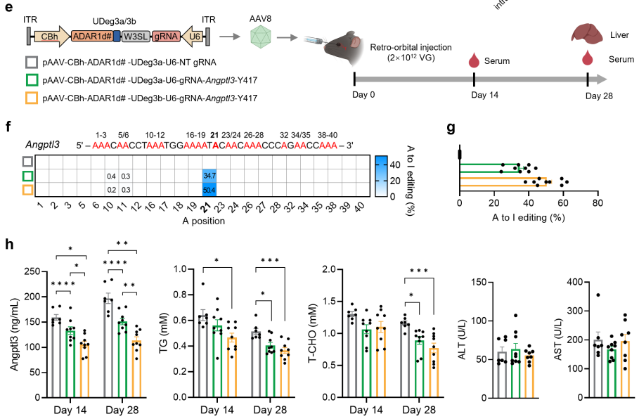 在基因治疗转化应用层面,RECODE系统展现了强大的治疗潜力。研究团队成功利用其在小鼠中高效纠正了与肌萎缩侧索硬化症(Amyotrophic Lateral Sclerosis,ALS)相关的FUS基因突变(图2),有效逆转了突变导致的FUS蛋白在神经元轴突中的错误定位。此外,RECODE还成功将治疗性突变引入Angptl3基因的RNA,在小鼠体内实现了持久且显著的血浆脂质水平降低,为心血管代谢疾病的基因治疗提供了新策略(图3)。