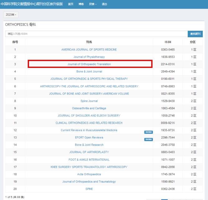 12月27日,《2023年中国科学院文献情报中心期刊分区表》正式发布;Journal of Orthopaedic Translation(简称“JOT”)进入医学学科1区。